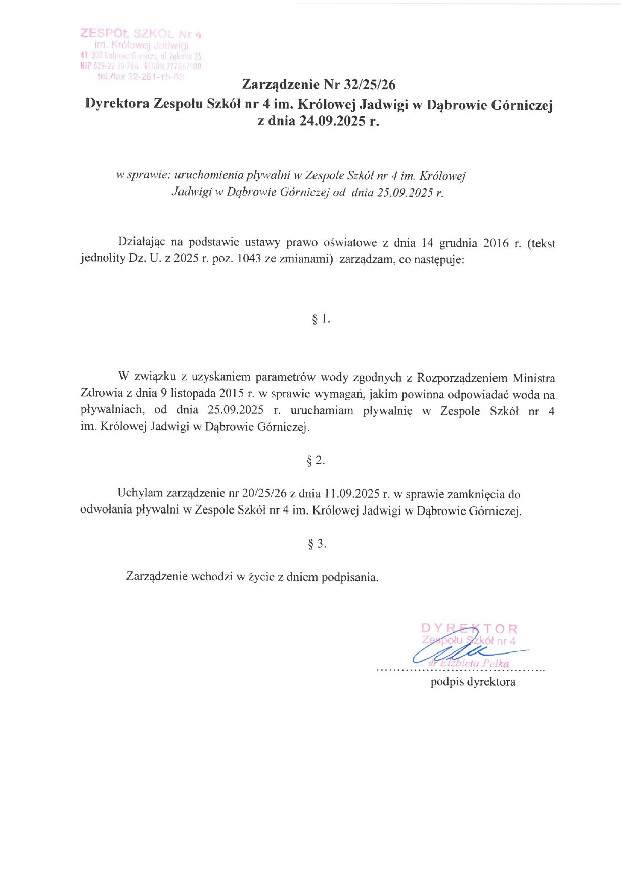 Informujemy, że z dniem 25.09.2025r. pływalnia zostaje  otwarta - parametry wody są zgodne z wymogami określonymi        w Rozporządzeniu Ministra Zdrowia z dnia 9 listopada 2015 r. w sprawie wymagań, jakim powinna odpowiadać woda na pływalniach.