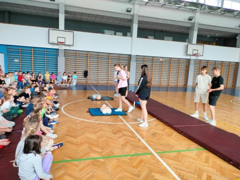 W projekcie wzięła udział młodzież z klas 7-8 szkoły podstawowej Lena P., Mikołaj D, Iwo M. (kl. 8A), Katarzyna N., Julia R. (kl. 7A), Kinga Sz., Aleksandra Wi., Aleksandra Wo., Alyona Z. (kl. 7B), oraz mgr Jarosław Ziętek który przygotował młodzież i prowadził projekt. Celem projektu było nauczenie i przygotowanie wybranego zespołu młodzieży do przeprowadzenia szkolenia dla wybranych grup szkolnych i przedszkolnych z zakresu pierwszej pomocy przedmedycznej (resuscytacja na fantomach oraz układnie poszkodowanego w pozycji bezpiecznej). Spotkania instruktażowe i zajęcia ćwiczebne odbywały się od lutego do kwietnia 2024, a projekt został sfinalizowany 22.05.24 wykonaniem przez młodzież kl. 7-8 przeszkolenia wszystkich grup przedszkolnych oraz klas 1A, 1B, 1C, 2A, 2B, 3A i 3B. Projekt spotkał się ze wspaniałym odbiorem przez dzieci, które mogły nie tylko pozyskać wiedzę n.t. pierwszej pomocy, ale przede wszystkim poćwiczyć to w praktyce. Zespół młodzieży który przeprowadził projekt, będąc przez chwilę w roli nauczycieli, był bardzo zadowolony i spełniony po przeprowadzeniu projektu, który wywarł na nich niezapomniane wrażenia.