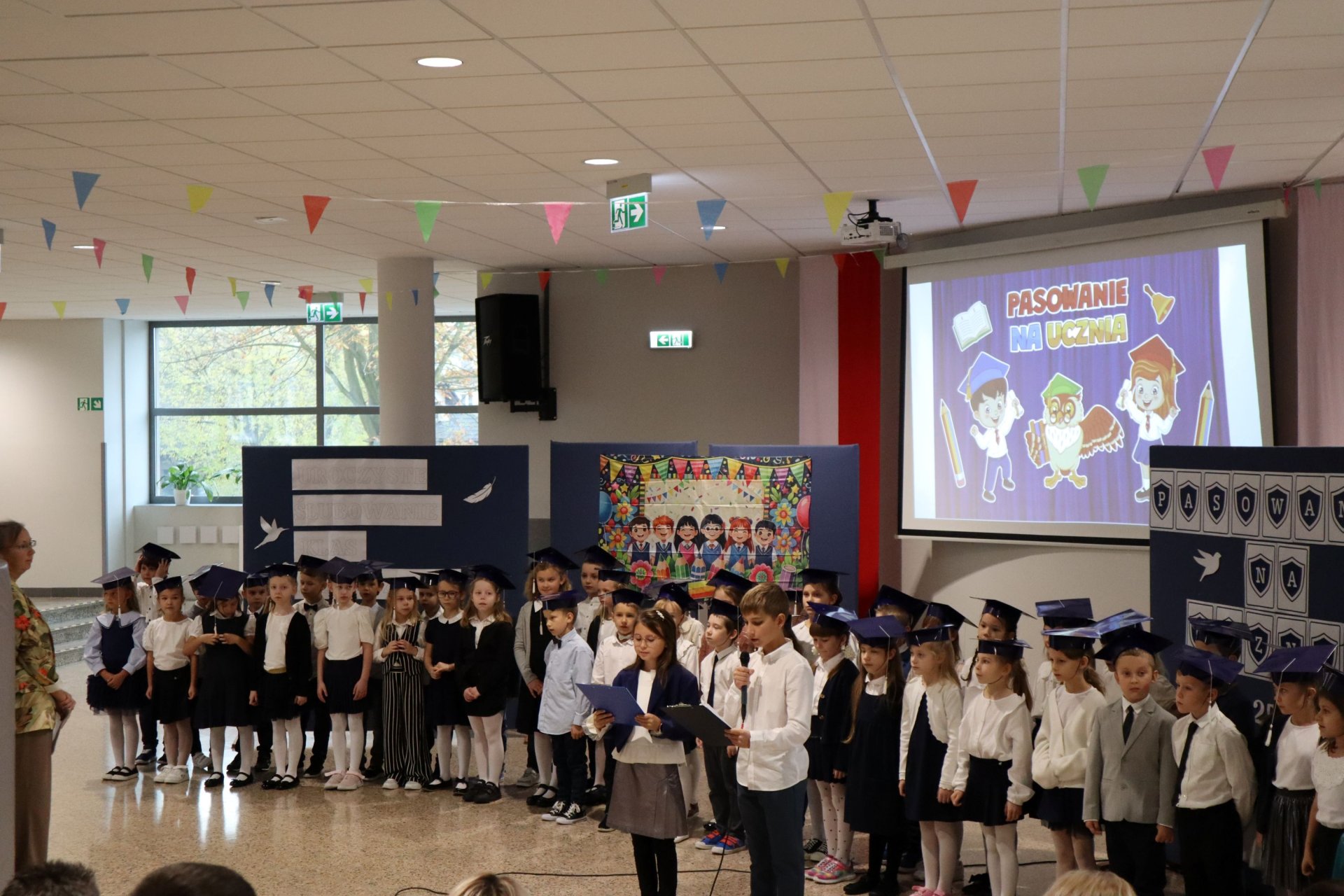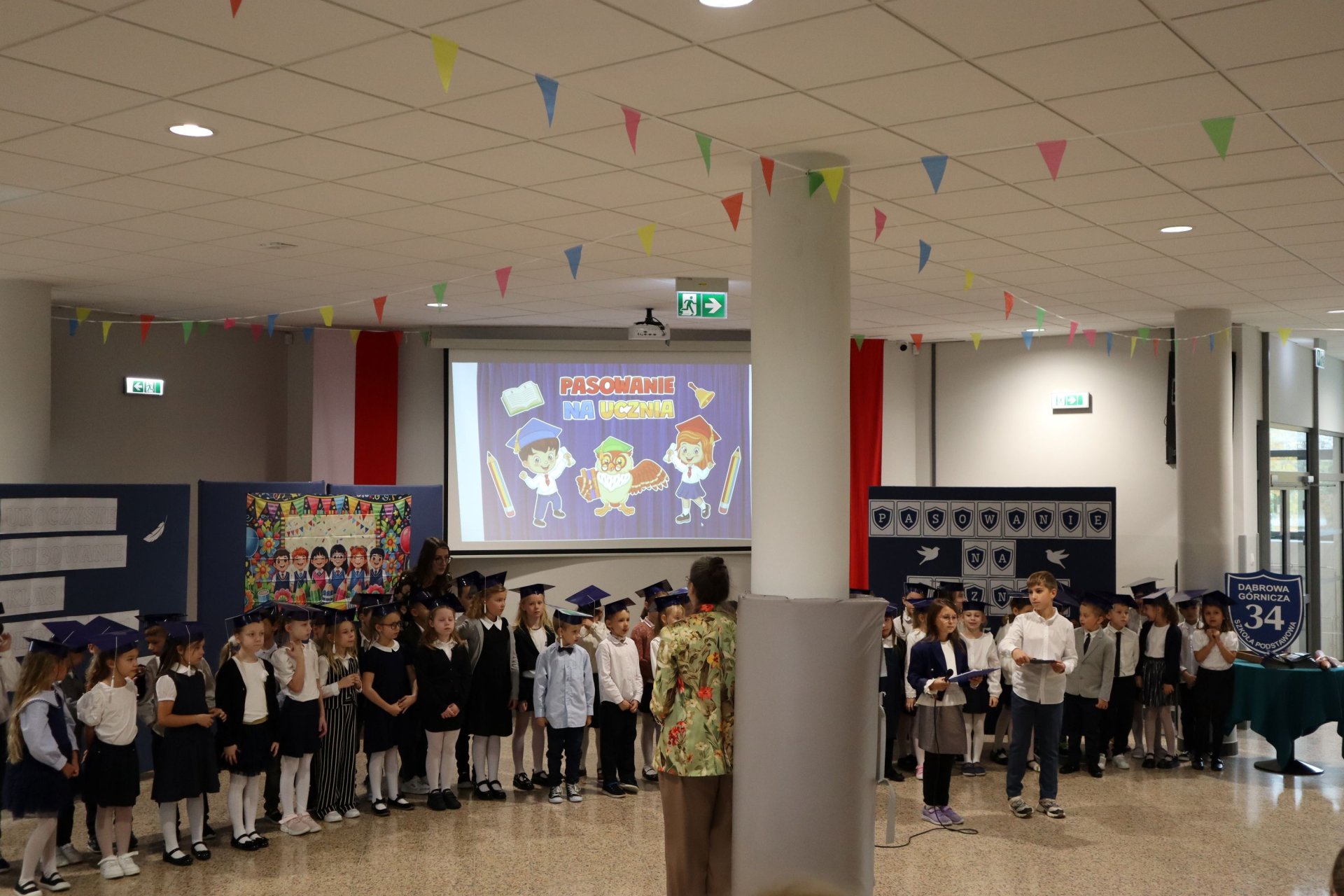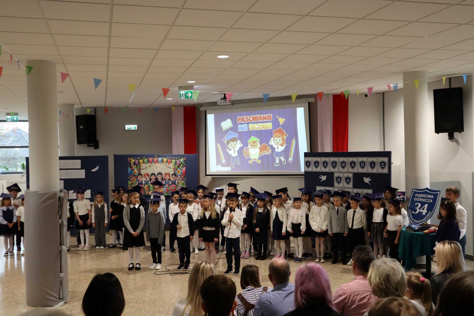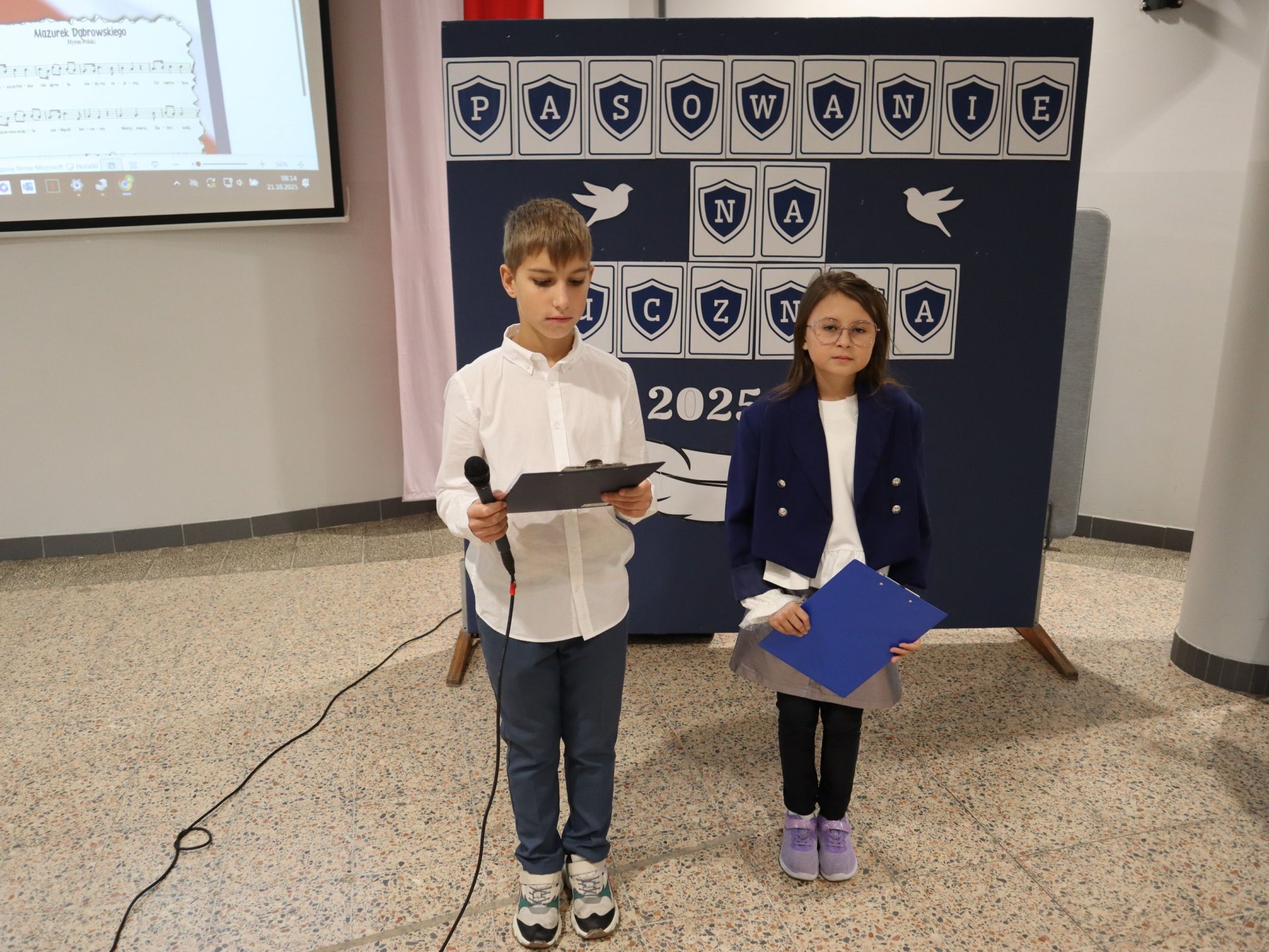 Dnia 21.10.2025 roku w naszej szkole odbyło się uroczyste pasowanie na ucznia klas pierwszych. Wydarzenie rozpoczęło się od odśpiewania hymnu narodowego, po którym najmłodsi uczniowie zaprezentowali przygotowany z wielkim zaangażowaniem program artystyczny pod kierunkiem swoich wychowawców i nauczycieli edukacji wczesnoszkolnej Pani Marty Trzebińskiej – klasa Ia oraz Pani Anny Ryś – klasa Ib. Najważniejszym momentem spotkania było pasowanie na ucznia, którego dokonały Pani Dyrektor zespołu dr Elżbieta Pełka oraz Pani Wicedyrektor mgr Małgorzata Brożek. Wśród gości nie zabrakło rodziców i bliskich, którzy z uśmiechem i wzruszeniem obserwowali swoje pociechy w tej wyjątkowej chwili. Po oficjalnej części uroczystości przyszedł czas na wspólne zdjęcia i słodki poczęstunek.