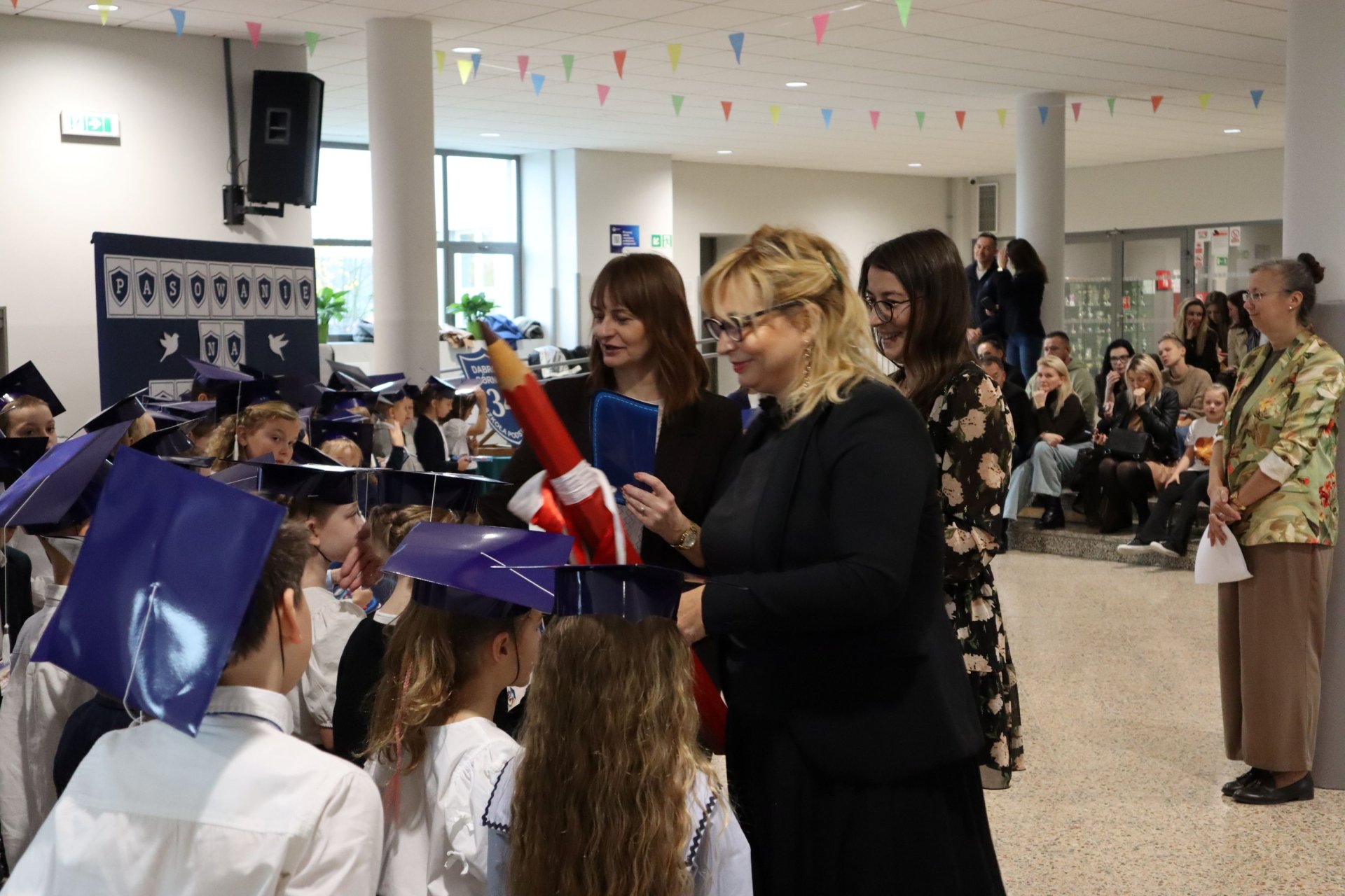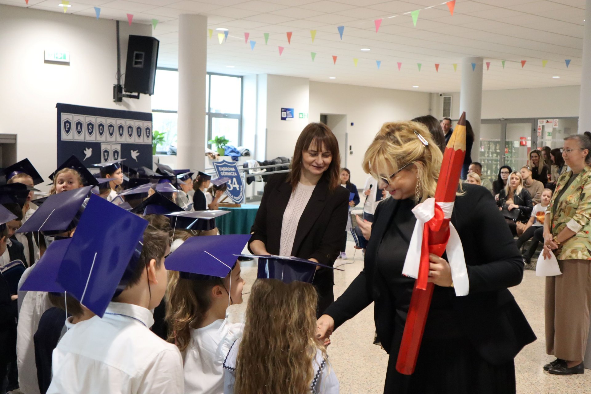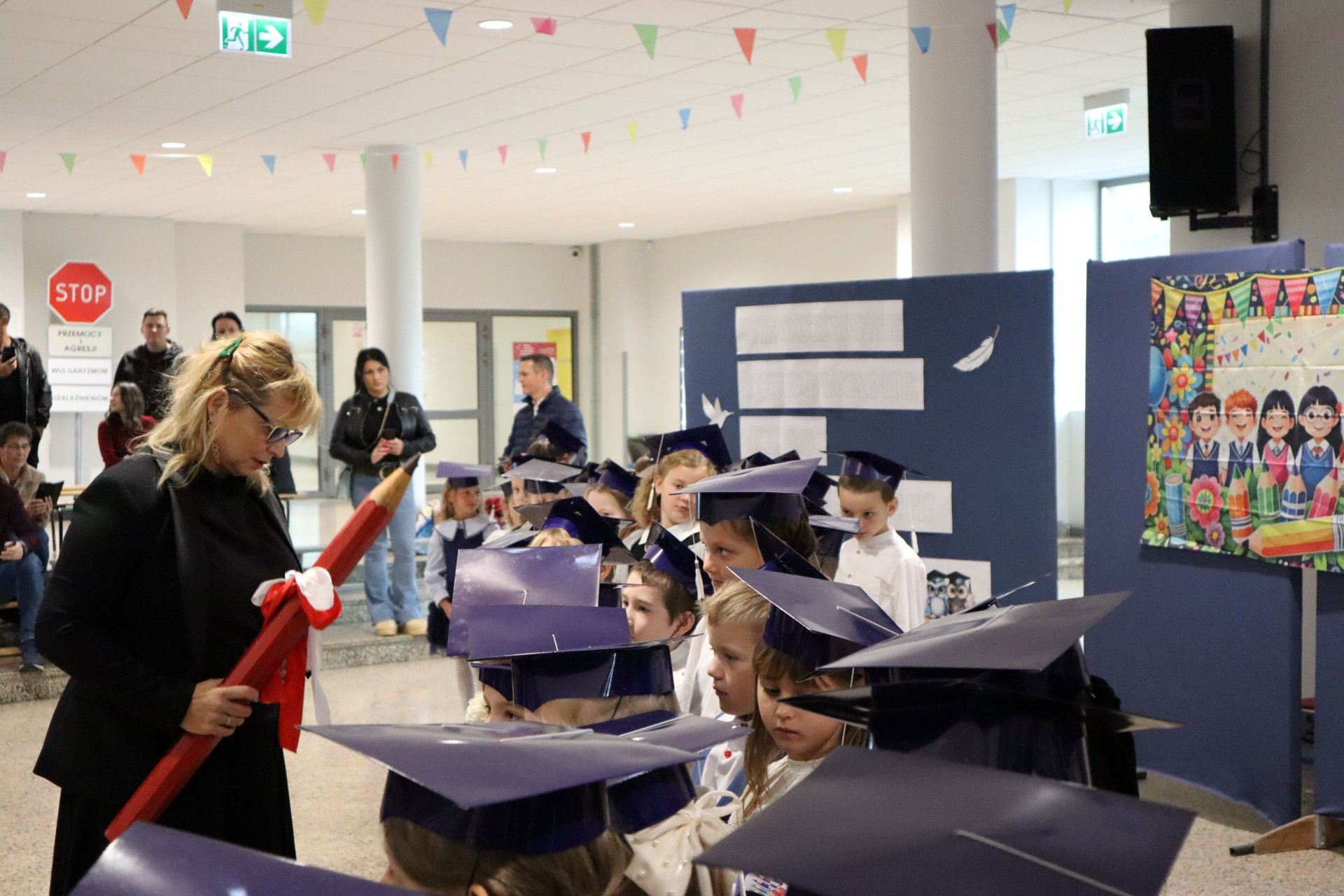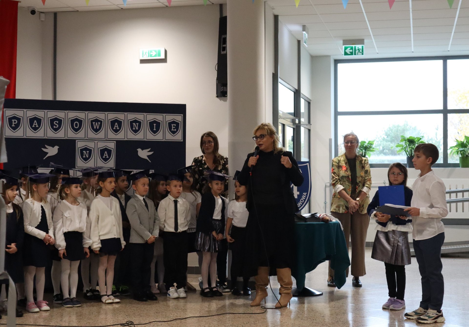 Dnia 21.10.2025 roku w naszej szkole odbyło się uroczyste pasowanie na ucznia klas pierwszych. Wydarzenie rozpoczęło się od odśpiewania hymnu narodowego, po którym najmłodsi uczniowie zaprezentowali przygotowany z wielkim zaangażowaniem program artystyczny pod kierunkiem swoich wychowawców i nauczycieli edukacji wczesnoszkolnej Pani Marty Trzebińskiej – klasa Ia oraz Pani Anny Ryś – klasa Ib. Najważniejszym momentem spotkania było pasowanie na ucznia, którego dokonały Pani Dyrektor zespołu dr Elżbieta Pełka oraz Pani Wicedyrektor mgr Małgorzata Brożek. Wśród gości nie zabrakło rodziców i bliskich, którzy z uśmiechem i wzruszeniem obserwowali swoje pociechy w tej wyjątkowej chwili. Po oficjalnej części uroczystości przyszedł czas na wspólne zdjęcia i słodki poczęstunek.