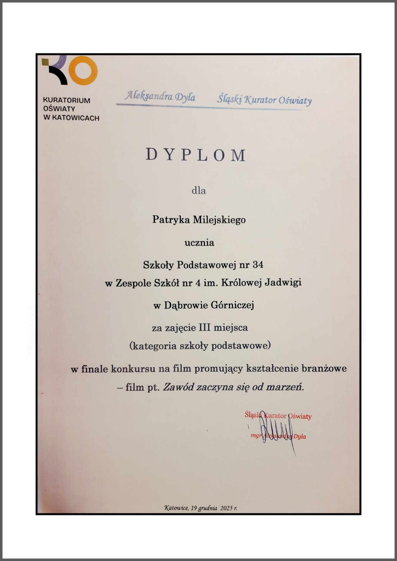 Z dumą informujemy, że to wspólny projekt Samorządu Uczniowskiego oraz Patryka Milejskiego, autora filmu - zdobył III miejsce w kategorii szkół podstawowych w woj. śląskim.