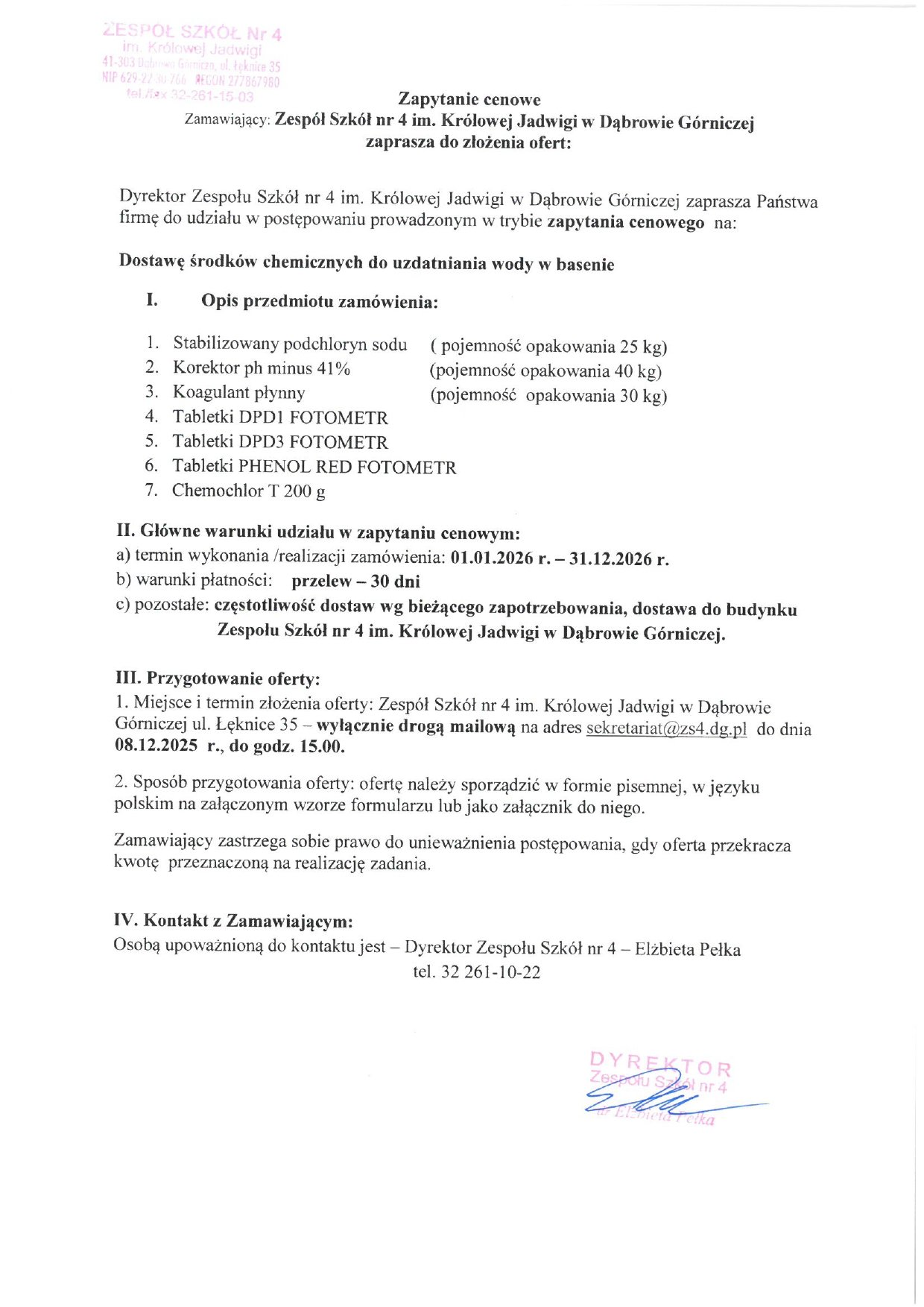 Zaproszenie do składania ofert na dostawę środków chemicznych na basen w trybie zapytania cenowego.